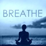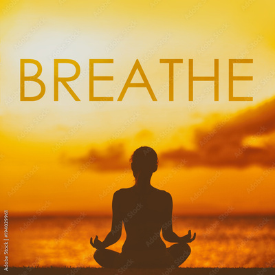 BREATHE yoga inspirational title on sunset beach background woman meditating in lotus pose yoga meditation at sunset. Word breathe written on copy space for motivation in health and fitness concepts.