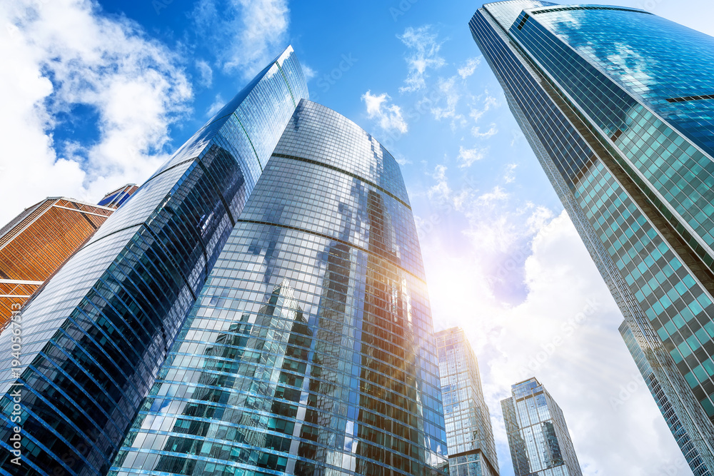 Low angle view of modern glass skyscrapers in Moscow City business district against blue sky with clouds. Contemporary financial architecture in Russia.