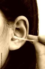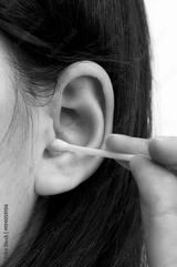 Woman with black hairs is cleaning her ears with white cotton bud. Personal hygiene concept.