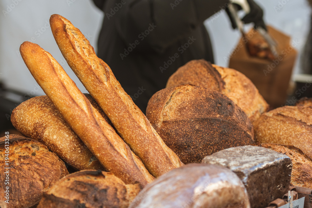 Freshly baked various types of bread displayed in wicker baskets at a bakery or street food market