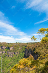 Picturesque landscape of vast eucalyptus forest and mountains under spectacular sky. Blue Mountains, Australia