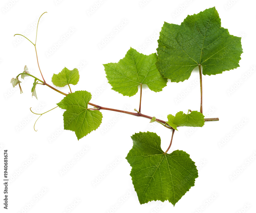 Fresh branch of grape vine with leaves and tendrils isolated on white background