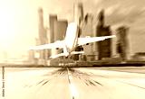Airplane back view at the airport take off against the background of the city and skyscrapers.