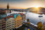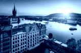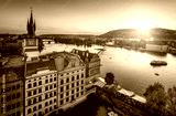 Evening in Prague. View of the roofs of houses and the river Vltava. Czech Republic.