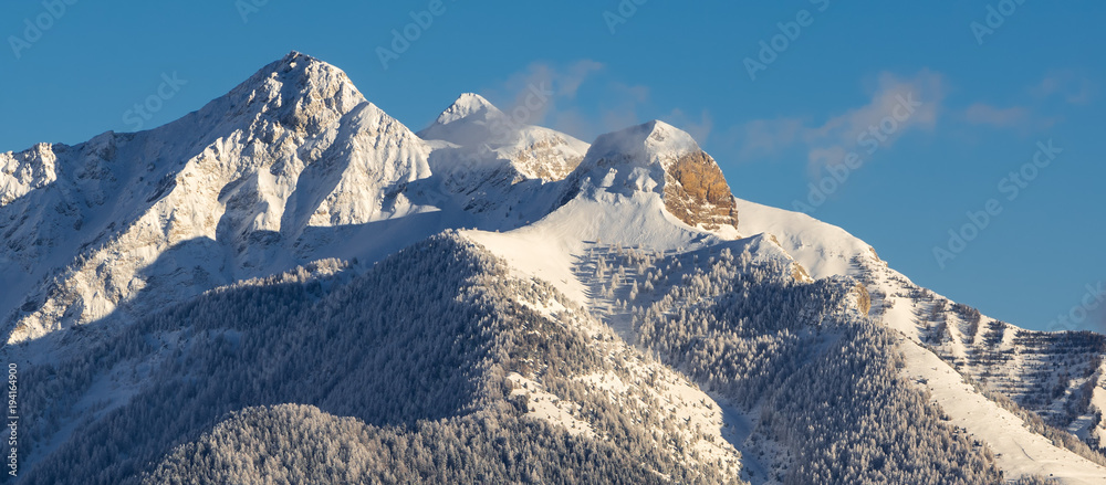 Winter in the mountains of the Champsaur in the Hautes-Alpes. Peaks of Piolit, Aiguille and Arche. Ecrins National Park, France