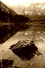 Beautiful Lago di Fusine mountain lake in autumn and Mangart mountain in the background at sunset