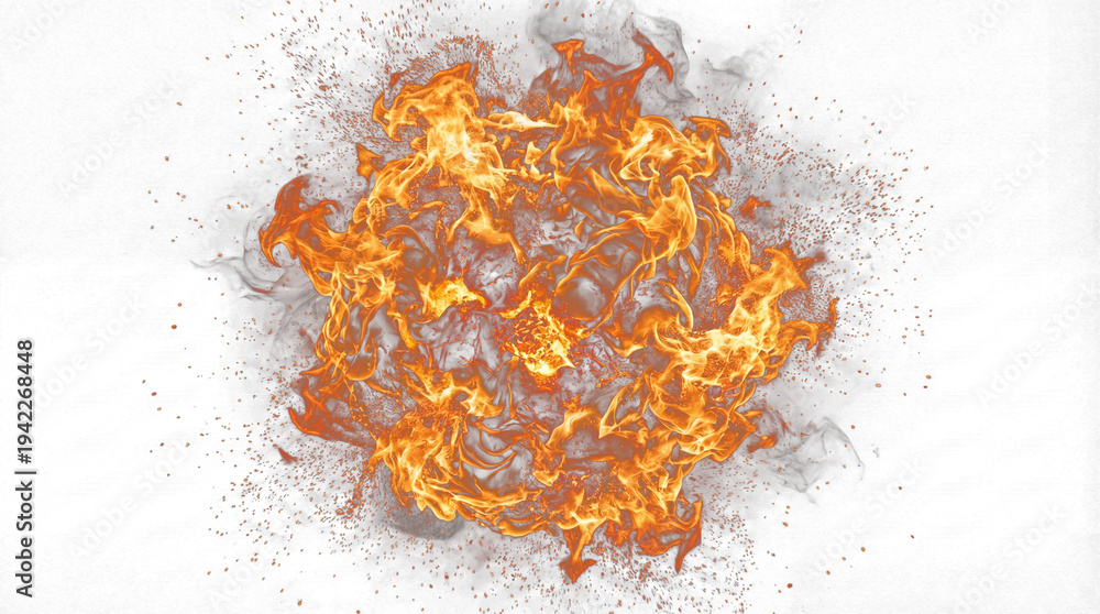 intense fireball explosion with fiery debris and smoke, dramatic 3d render depicting raw power and destructive energy on a black canvas