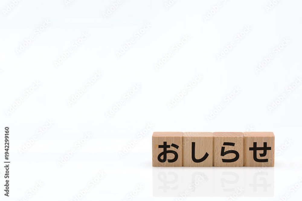 白ツヤ背景の右下に配置された「おしらせ」の積み木 木製ブロック コピースペース 白バック