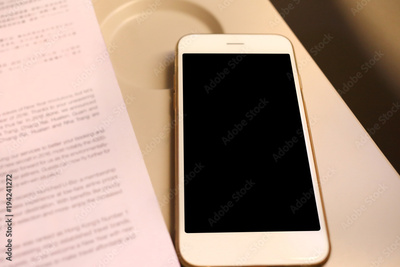Mockup smartphone and book on plane passenger seat