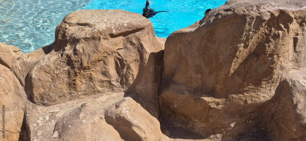 Rocky coastline with clear blue water on sunny day