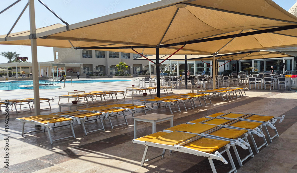 Outdoor pool area with sun loungers and shade structures