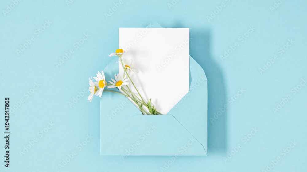 White chamomile flowers in a blue envelope with a blank greeting card on a pastel background. Minimalist spring flat lay, mockup for wedding invitation, Mother's Day, or romantic letter.