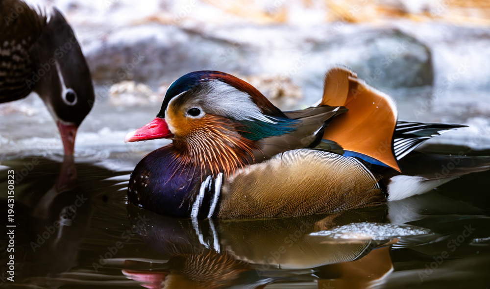 Close-Up Portrait Of A Mandarin Duck Swimming In A Pond