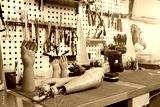 Various artificial hands and a partial arm rest on a gridded workbench in a well-lit workshop. Tools hang above the work surface used to create and customize prosthetics