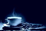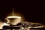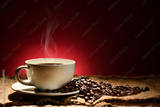 Cup of coffee with smoke and coffee beans on reddish brown background