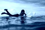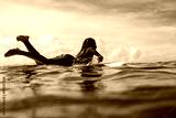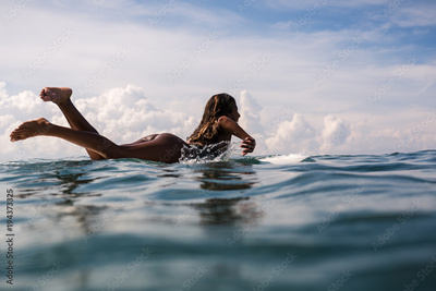 Beautiful young indonesian woman in bikini surfing wave in Bali on the background of blue sky, clouds and tropical beach