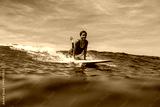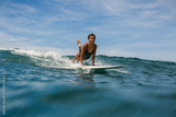 Beautiful young indonesian woman in bikini surfing wave in Bali on the background of blue sky, clouds and tropical beach