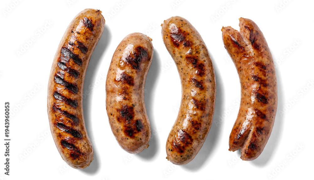four grilled sausages with distinct grill marks and seasonings, presented against a stark transparent background for a clean, food-focused presentation.