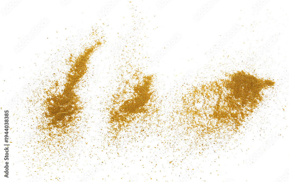 Tofu spice, seasoning mix, (coriander, turmeric, lemongrass, yellow mustard seeds, ginger, cumin, sweet paprika, garlic, sage, fennel, rosemary, thyme, black cumin, nutmeg) isolated on white, top view