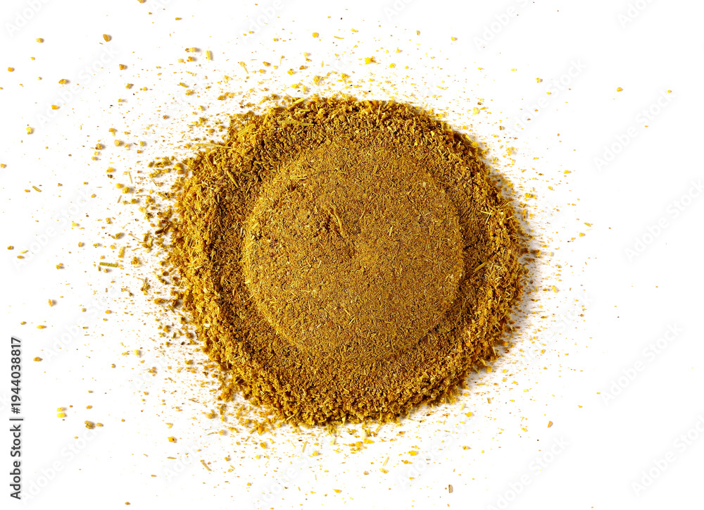 Tofu spice pile, seasoning mix, (coriander, turmeric, lemongrass, yellow mustard seeds, ginger, cumin, sweet paprika, garlic, sage, fennel, rosemary, thyme, black cumin, nutmeg) isolated on white