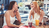 Friends meeting in a cafe. Young women drinking coffee and enjoying in conversation. Consumerism, lifestyle concept