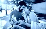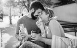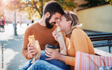 Couple eating a sandwich outdoors. Dating, consumerism, food, lifestyle concept