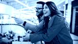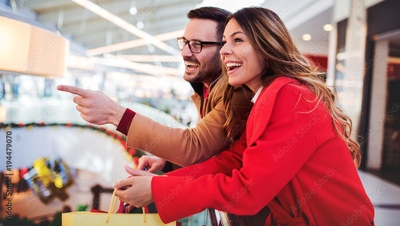 Shopping time. Young couple shopping together in shopping mall. Consumerism, love, dating, lifestyle concept