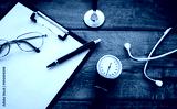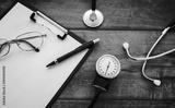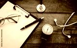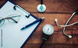 Doctor workplace. Stethoscope with notebook and pencil on the wooden table. Medical concept