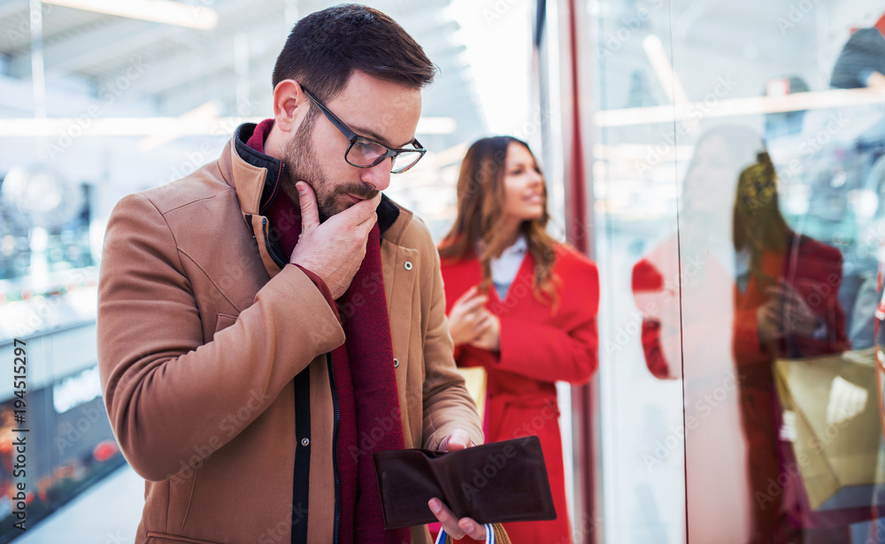 Shopping time. Young couple shopping together in shopping mall. Consumerism, love, dating, lifestyle concept