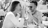 Romantic couple drinking coffee, having a date in the cafe. Dating, love, relationships
