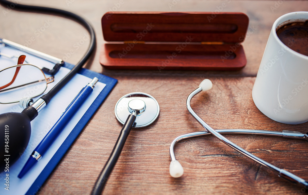Doctor workplace. Stethoscope with notebook and pencil on the wooden table. Medical concept