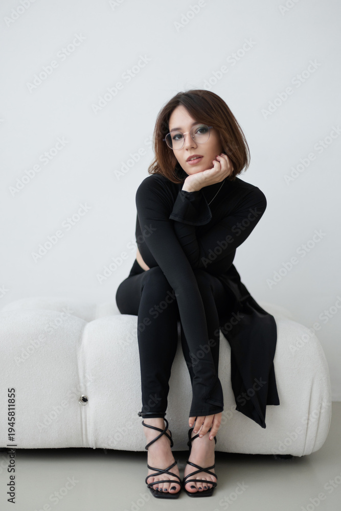 Studio shot of a woman with a bob haircut wearing an elegant black ensemble and eyewear. The bright, neutral background and sophisticated pose create a versatile high-end fashion image.