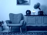 Vintage interior of retro orange armchair, vintage wooden light blue sideboard, old phonograph (gramophone), vinyl records and illuminated table lamp