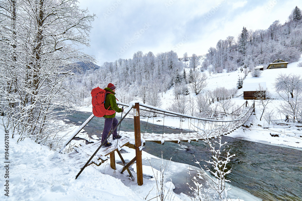 Man hiking at sunset mountains with heavy backpack.