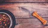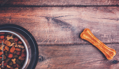 Dog food on wooden background. Top view. Pets and animals concept