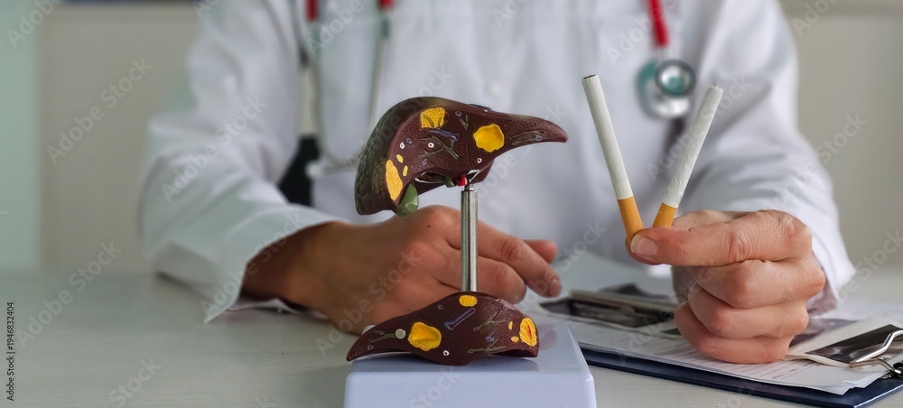 Model of liver with cigarettes, symbolizes the effect of nicotine and smoking on liver health