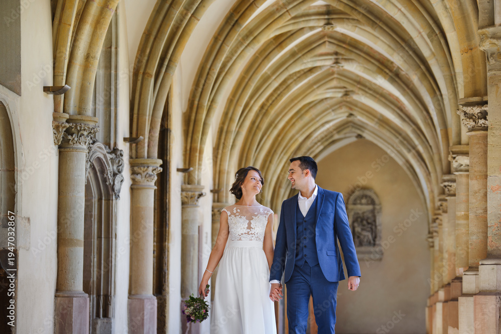 Happy couple in the church. Wedding photo. Couple in love.