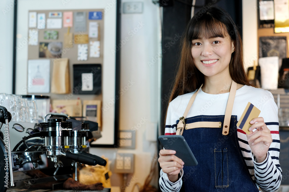 Young asian woman barista using smartphone and holding credit card at cafe counter, food and drink business concept