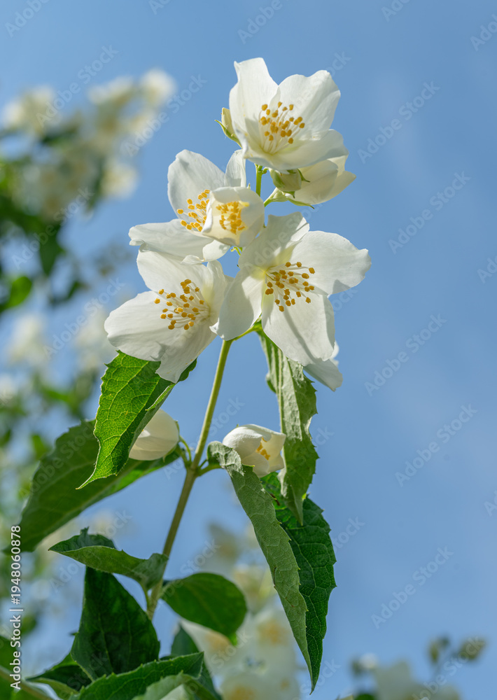 White jasmine flowers blooming on a jasmine bush (Philadelphus) against a clear blue sky.