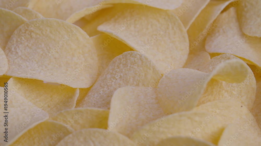 Vivid closeup of golden seasoned crunchy potato slices for advertising, Detailed and colorful closeup photo of stacked salted potato crisps arranged closely together