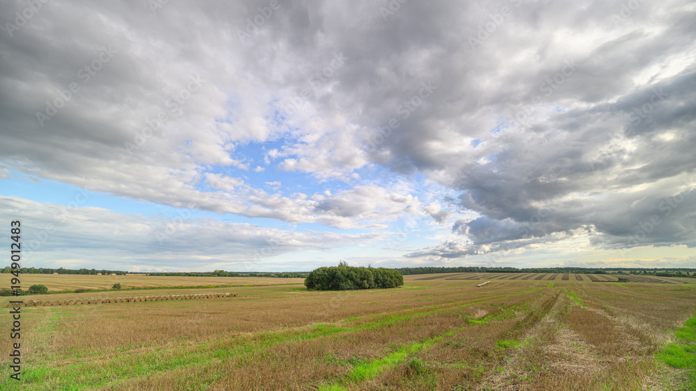 A Beautiful Scenic Agricultural Landscape Set Beneath a Dramatic, Cloudy Sky Above