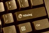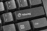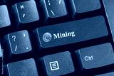 Blue colored Bitcoin Mining button on black computer keyboard. Crypto currency Internet data privacy information security concept. Mining cryptocurrency