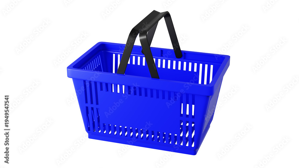 Plastic shopping basket, blue empty store basket, supermarket shopping cart concept, 3D rendering, isolated on white background, retail, grocery, consumer shopping, market container.