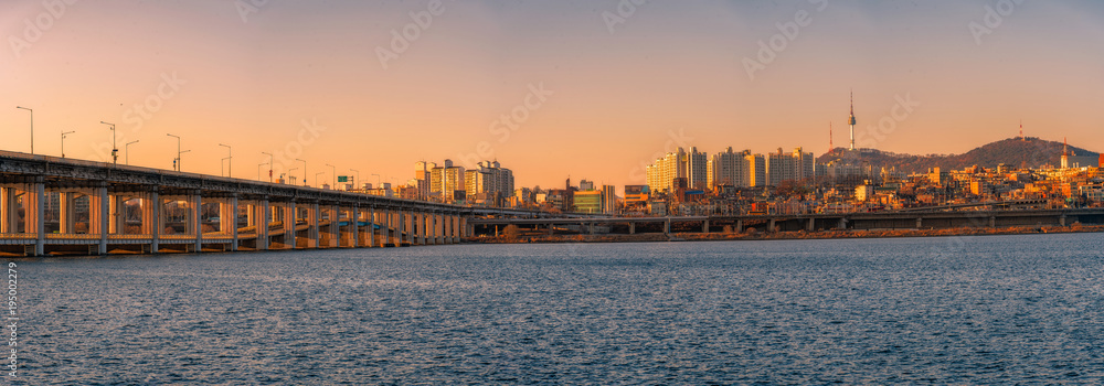 Banpo Bridge at hangung river and Seoul tower in seoul, Soth Korea.