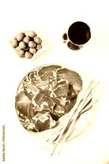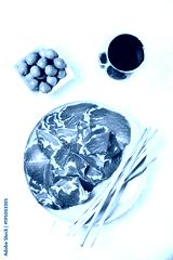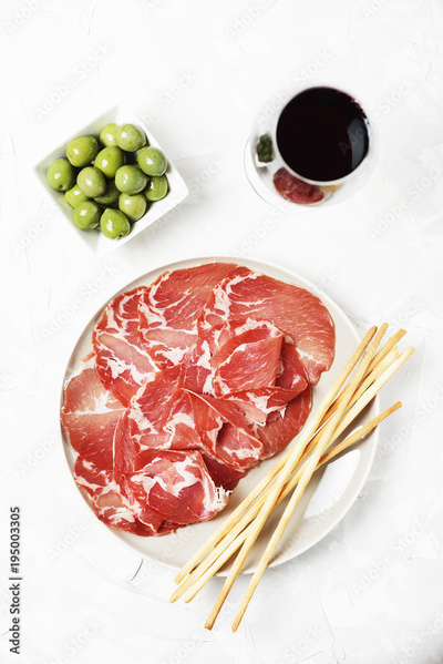 Delicious appetizer with bread sticks and ham, selective focus and top view