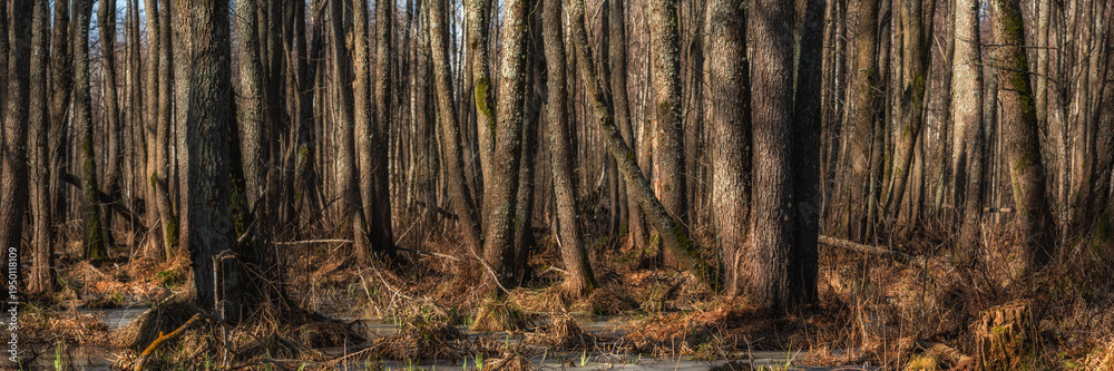 inside the spring forest. bare trees on hummocks in a swampy March woodland. beautiful side light. Panorama photo of a natural landscape in 3:1 format