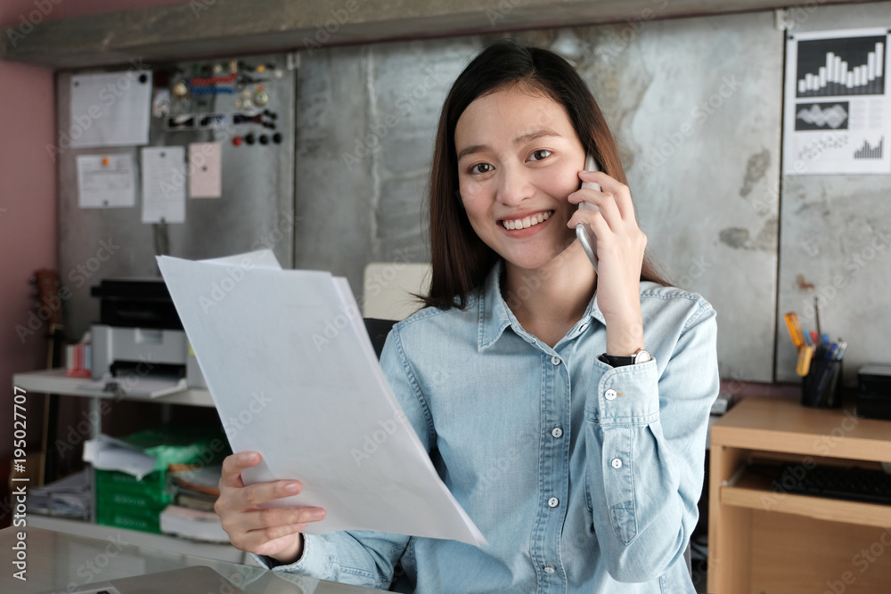 Young asian businesswoman talking phone and holding papers at office table, business casual lifestyle