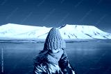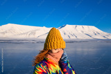 Close-up of a girl in a rainbow down jacket yellow knitted cap with red hair beautiful young hair on the background of the mountain Svalbard Longyearbyen Norway day north pole in winter