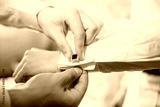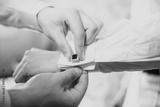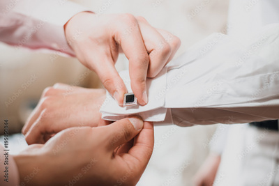 The groom fastens the cufflink on the sleeve of the shirt