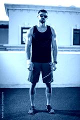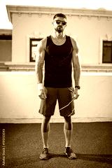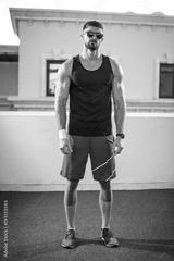 Full length portrait of handsome man in sportswear with sunglasses posing outdoors.